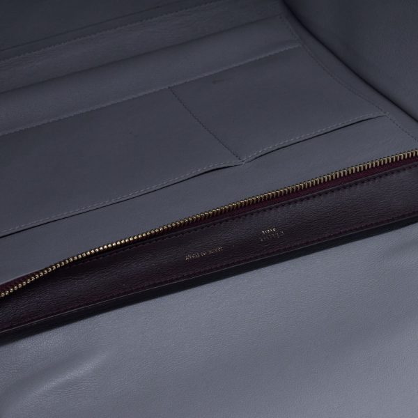 Das Modell Trapeze von Céline ist ein Must Have unter den Taschenliebhaberinnen. Sie kann weiblich in der Hand oder elegant am Körper getragen werden. Die Seiten der Tasche lassen sich nach innen falten, um ihr eine andere Form zu verleihen. Diese Tasche verbindet dunkelgrünes Strukturleder, bordeauxfarbenes Glattleder und graublaues Velourleder. Das Innere der Tasche verfügt über zwei Einsteckfächer und ist auskleidet in blauem Leder. Schließen lässt sich die Tasche über einen Reißverschluss und einen goldfarbenen Verschluss.