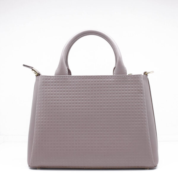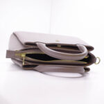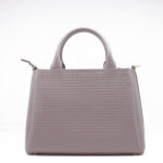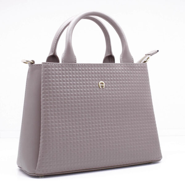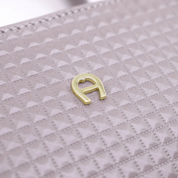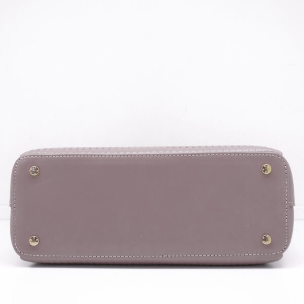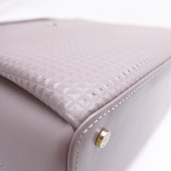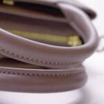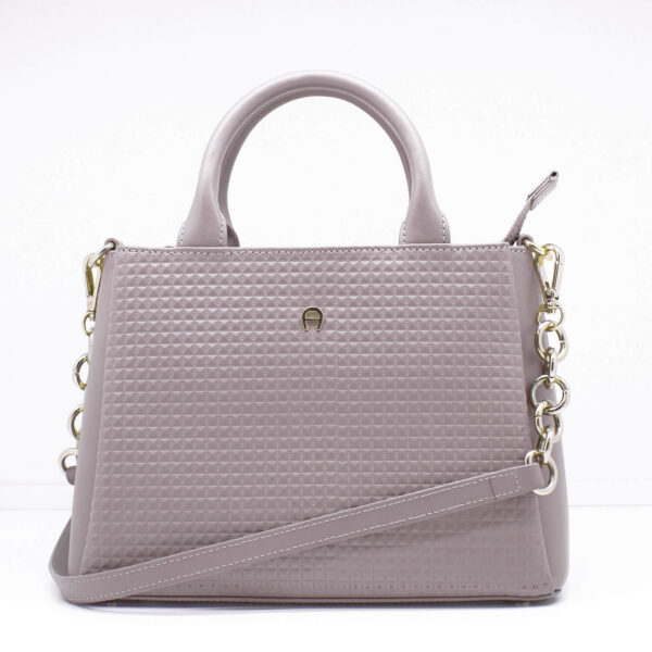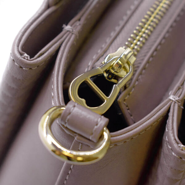 Dieses Modell besteht aus drei großen Fächern, zwei davon lassen sich über Druckknöpfe schließen und das Hauptfach wird über einen hochwertigen, goldenen Reißverschluss verschlossen. Im Inneren befindet sich noch ein großes Einsteckfach. Der Innenraum ist in einem edlen, schwarzgrauen Stoff ausgekleidet. Die Tasche kann elegant in der Hand oder Crossbody getragen werden.