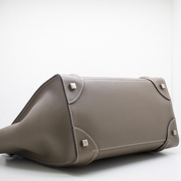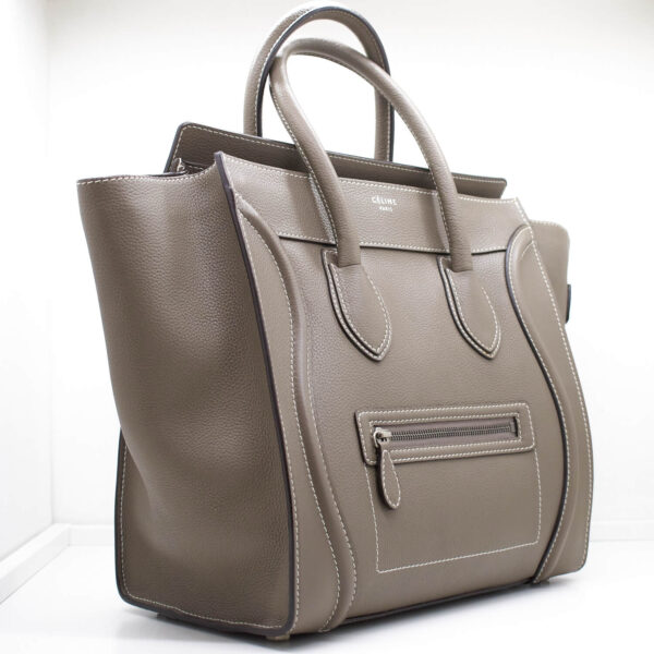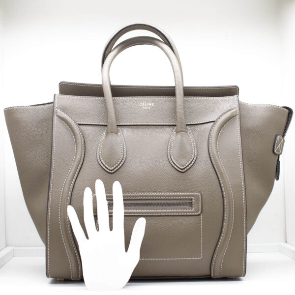 Bei dieser beliebten Céline Bag wird ein wunderschöner Taupeton in einer klassischen, trapezförmigen Tasche verbunden. Vollendet wird diese Schönheit mit einer hochwertigen silbernen Hardware und einer edlen, weißen Naht.