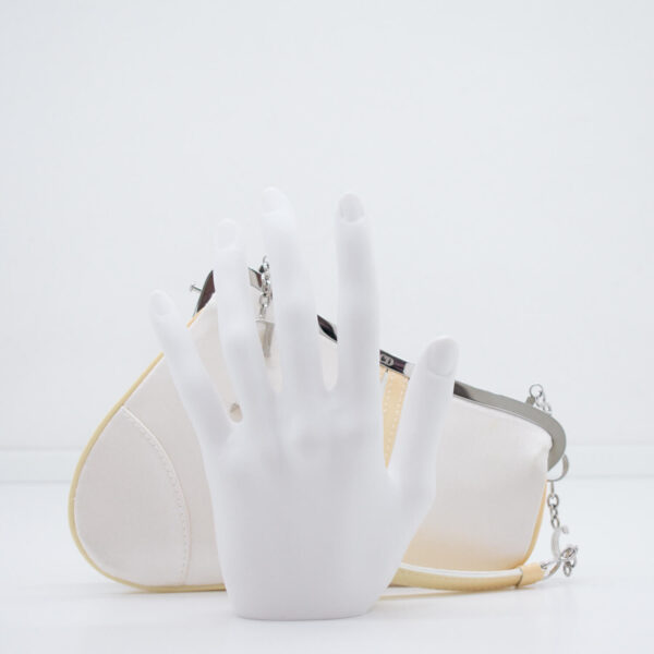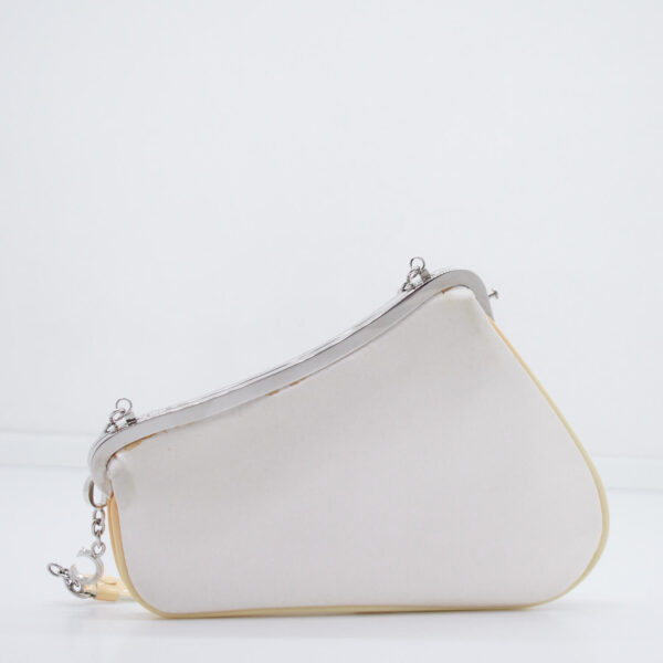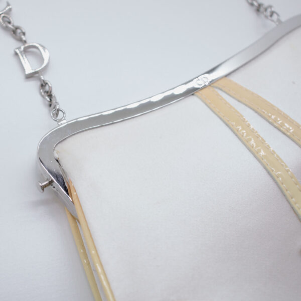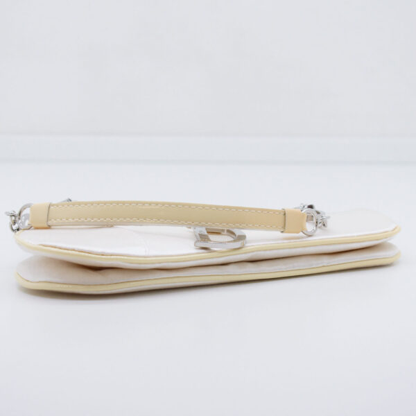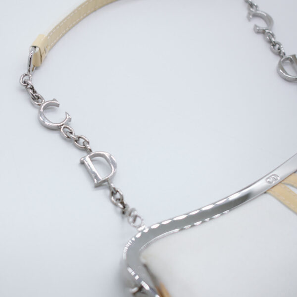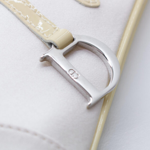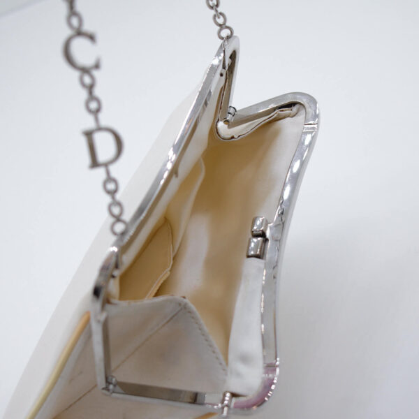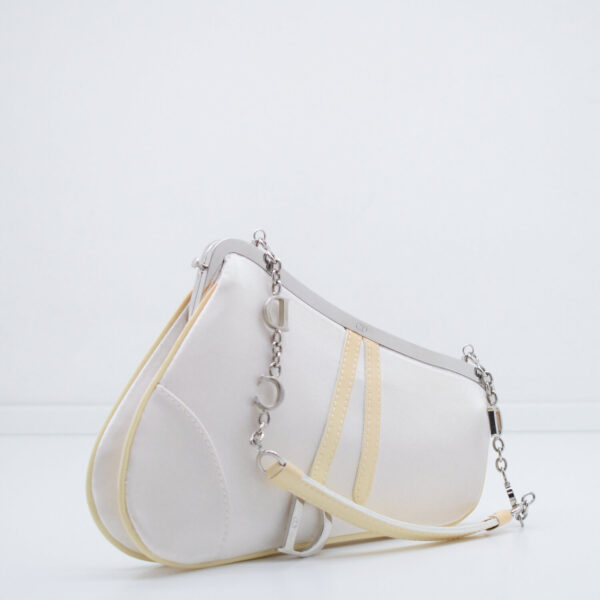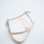 Dieses Modell steht für seine ikonische, unverkennbare Form. Wir sind verliebt in dieses Dior Highlight. Diese Saddle Bag lässt sich feminin in der Hand tragen. Innen ist sie ebenfalls mit weißem Seidenstoff ausgekleidet und verfügt über ein kleines Einsteckfach. Geschlossen wird die Tasche über einen seitlich liegenden Druckknopf.