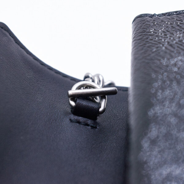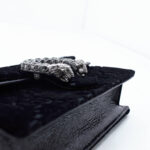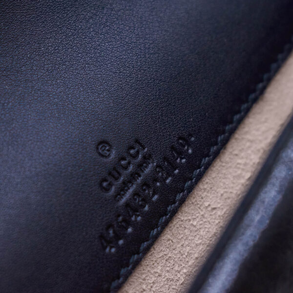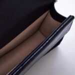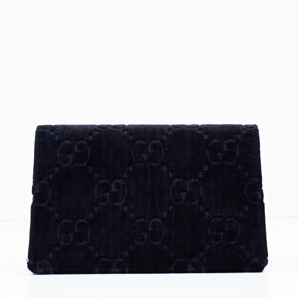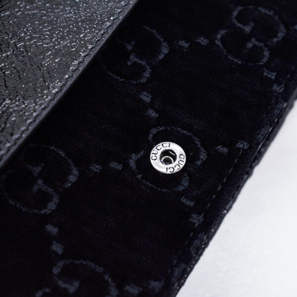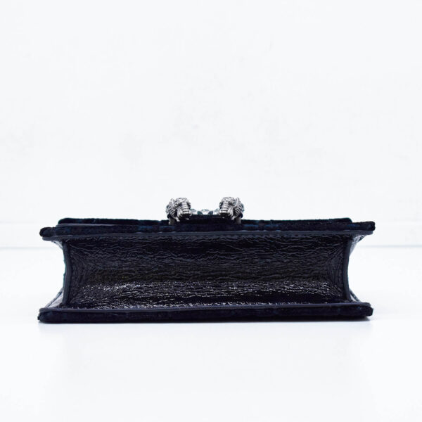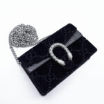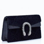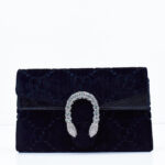 Dieses Schätzchen ist eine wirklich seltene Ausgabe der Gucci Dionysus Mini Bag. Die Tasche kommt in einem zeitlosen schwarzen Samtstoff, welcher bei Licht seine dunkelblauen Reflexe strahlen lässt. Die schwarzen Lacklederdetails vollenden diese Schönheit. Mit diesem Schätzchen wird jedes Outfit zum Highlight. Durch den praktischen Kettenriemen kann die Tasche auf der Schulter oder Crossbody getragen werden. Innen verfügt sie über einen kleinen Karabinerhaken und verschlossen wird diese Tasche über einen Druckknopf.