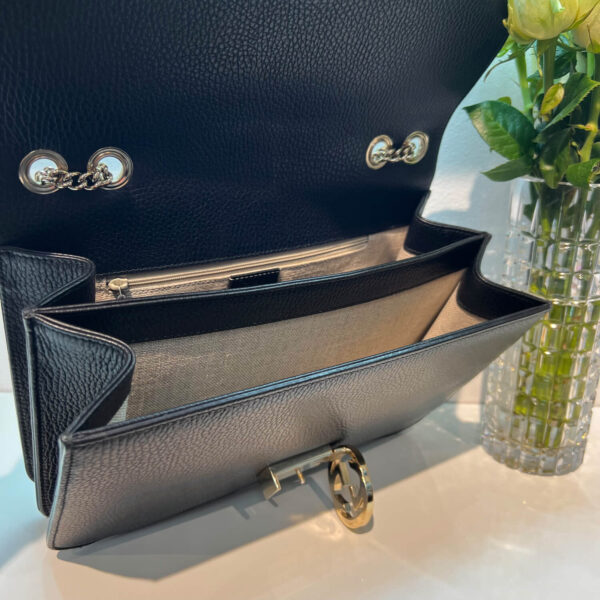 Mit diesem Schätzchen wird jedes Outfit zum Highlight. Durch den praktischen Kettenriemen kann die Tasche auf der Schulter, Crossbody oder in der Hand gehalten werden.