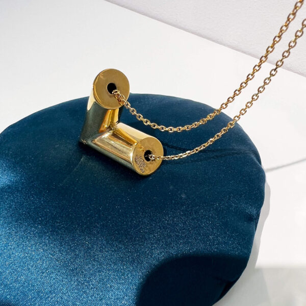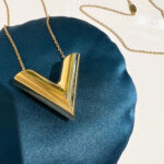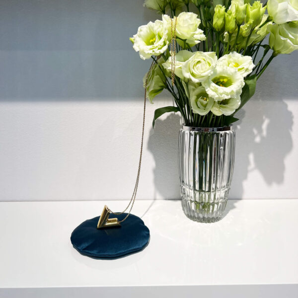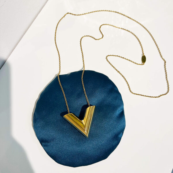 Ein sehr schönes, edles Schmuckstück aus dem Hause Louis Vuitton. Klassisch und doch auffällig besticht diese lange, goldene Kette durch ihre zeitlose Eleganz. Der Anhänger in Form eines „V“ lässt Louis-Fans Herzen höher schlagen.