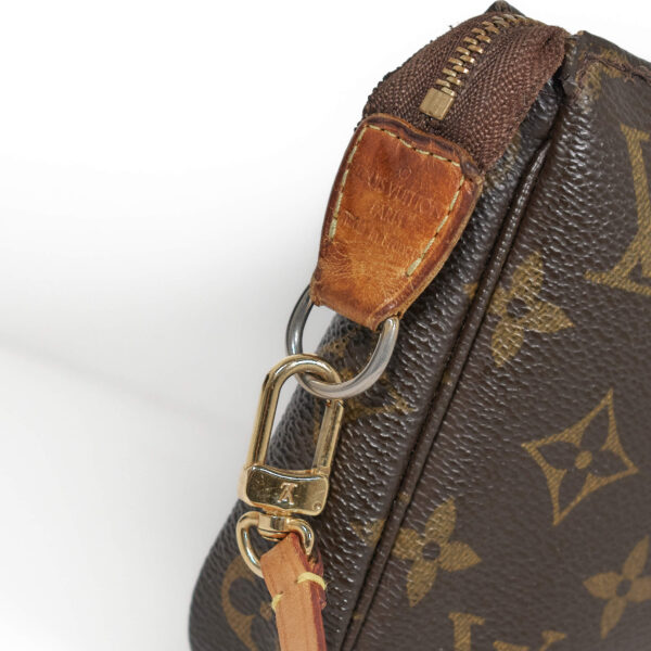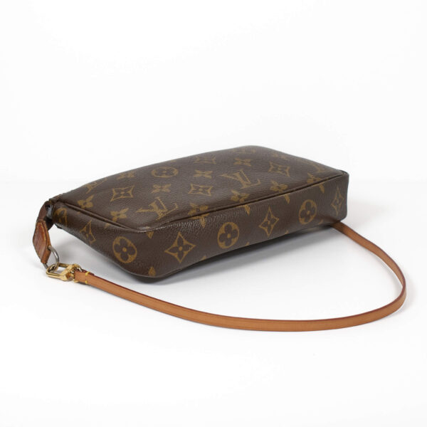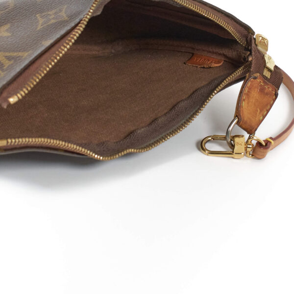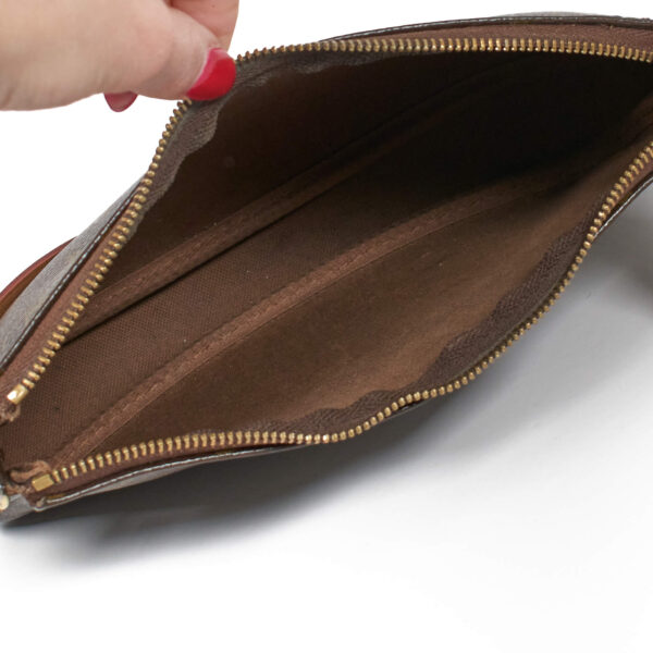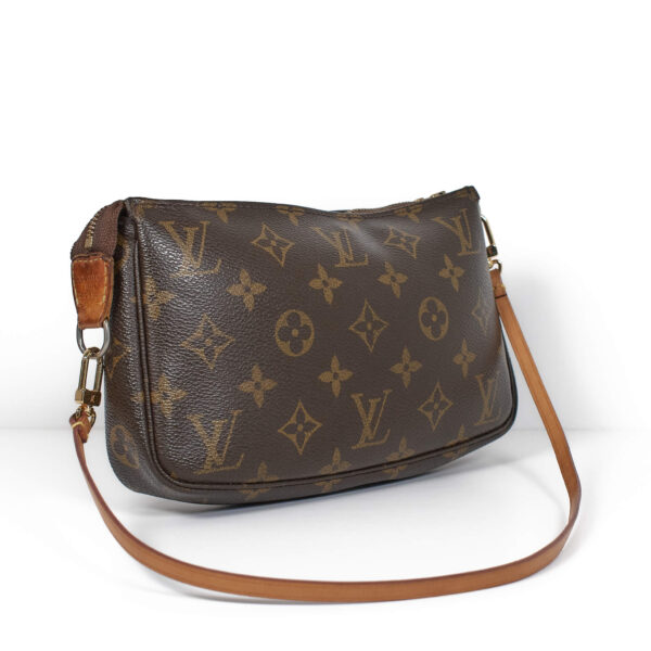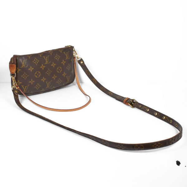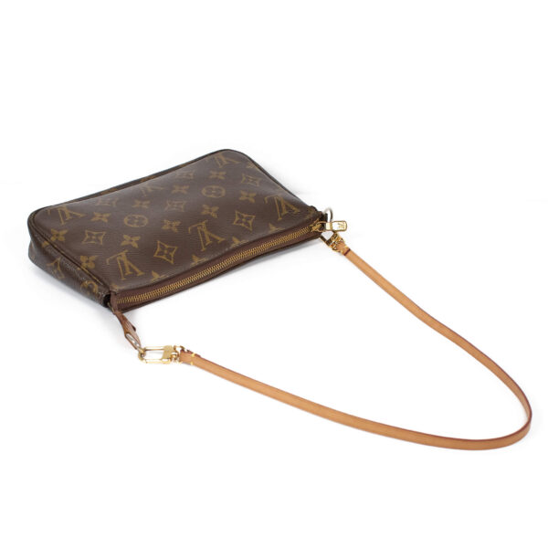 Die Pochette verfügt über ein großes Innenfach und kann über einen Reißverschluss geschlossen werden. Der kurze Riemen der Tasche lässt Sie die Tasche als Clutch, kleine Schultertasche oder auch als zusätzliche Innentasche für Ihre Handtasche nutzen. Der kleine Riemen ist schon eine längere Variante als sonst. Der Extrariemen aus Monogram Canvas ist perfekt um die Tasche lässig als Crossbody Bag zu tragen. Allein der längere Riemen liegt im Neupreis aktuell bei 310€.