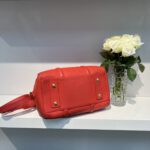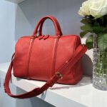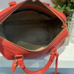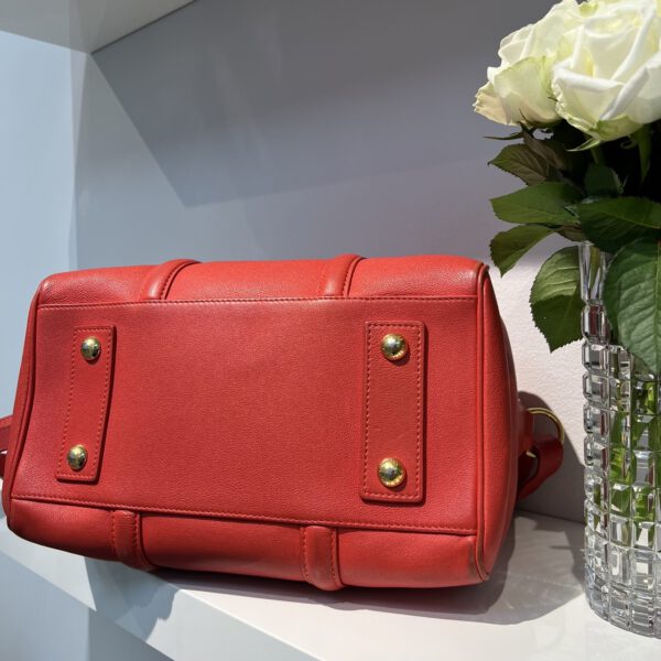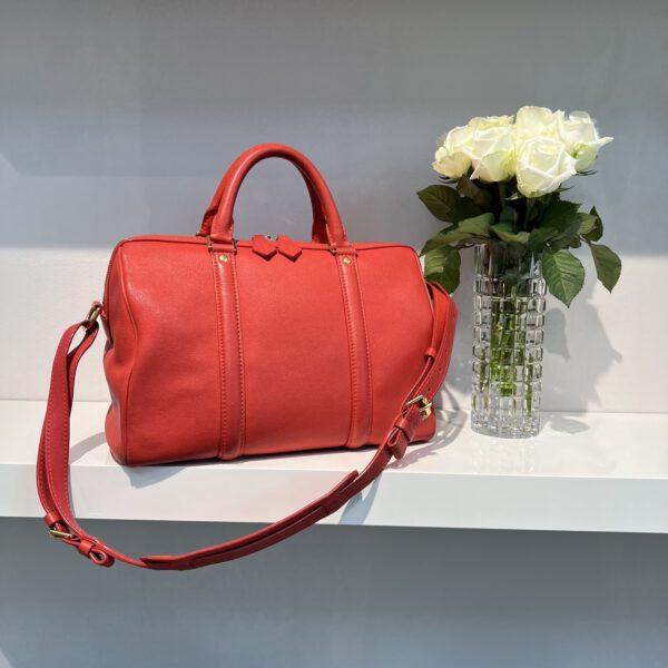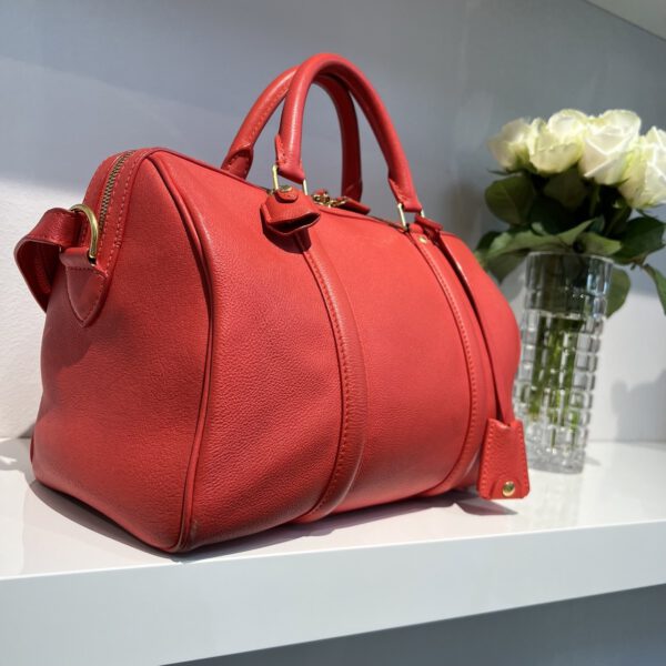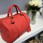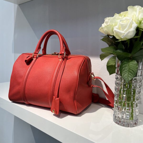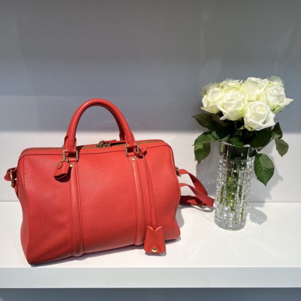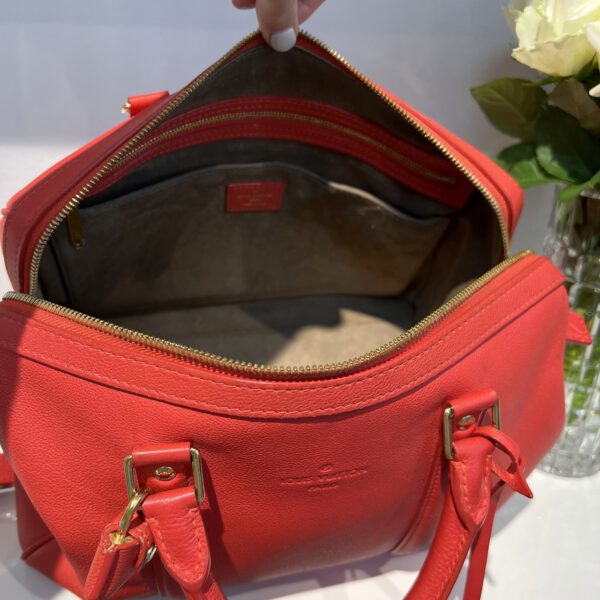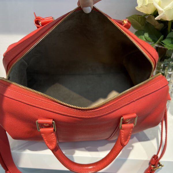 Die Tasche lässt sich feminin in der Hand tragen oder durch den kurzen Schulterriemen auch praktisch schultern. Die Form ähnelt sehr der klassischen Speedy. Im Inneren ist die Tasche in einem dunkelbraunen Wildleder ausgekleidet und verfügt über zwei Einsteckfächer, eines davon lässt sich über einen Reißverschluss verschließen.