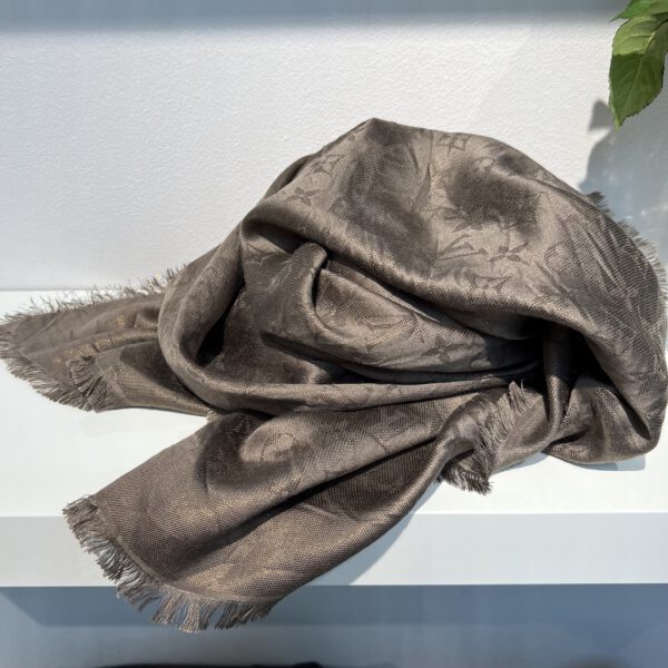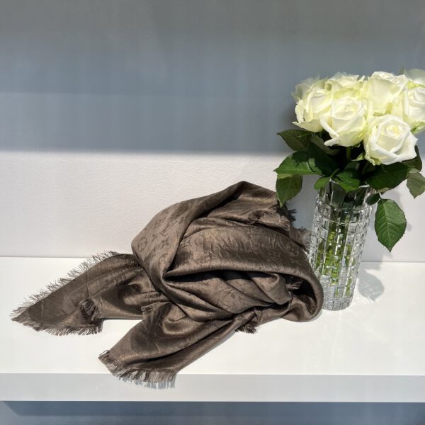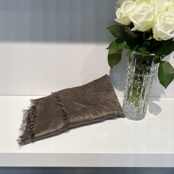 Beidseitig tragbar durch die tolle Farbzusammensetzung. Farbe Taube mit gold-kupferfarbenem Garn. Je nach Lichteinfall wirkt das Tuch kühler / wärmer vom Farbton.