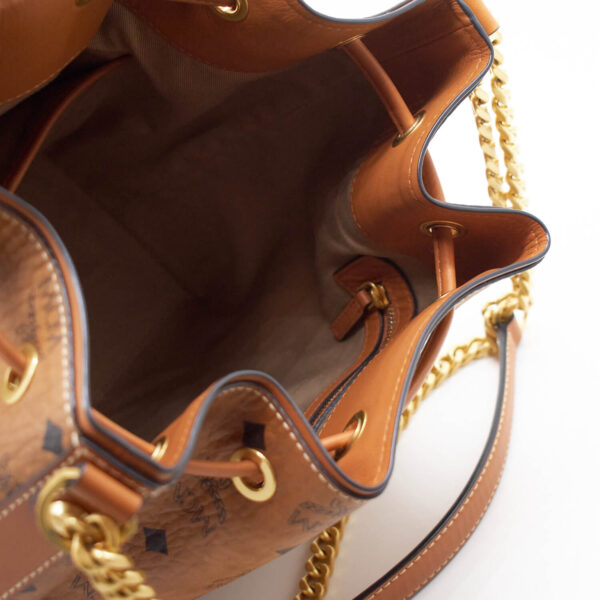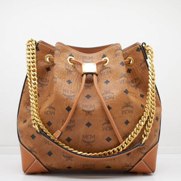 Diese Beuteltasche aus dem Hause MCM ist ein wahrer Eyecatcher! Durch den Kettenriemen lässt die Tasche sich bequem schultern oder Crossbody tragen. Geschlossen wird sie über einen auffälligen Kordelzug. Innen verfügt sie über ein kleines Einsteckfach, welches sich über einen Reißverschluss schließen lässt. Das Innere ist in einem hochwertigen, hellrosefarbenem Stoff ausgekleidet.