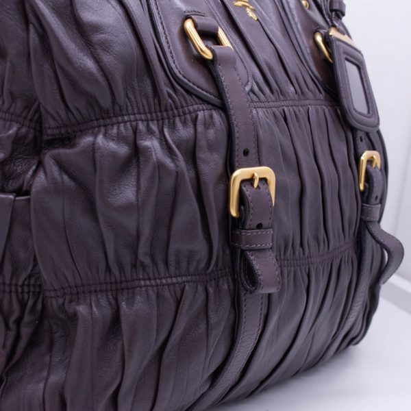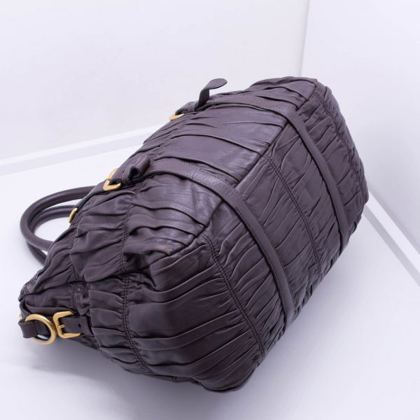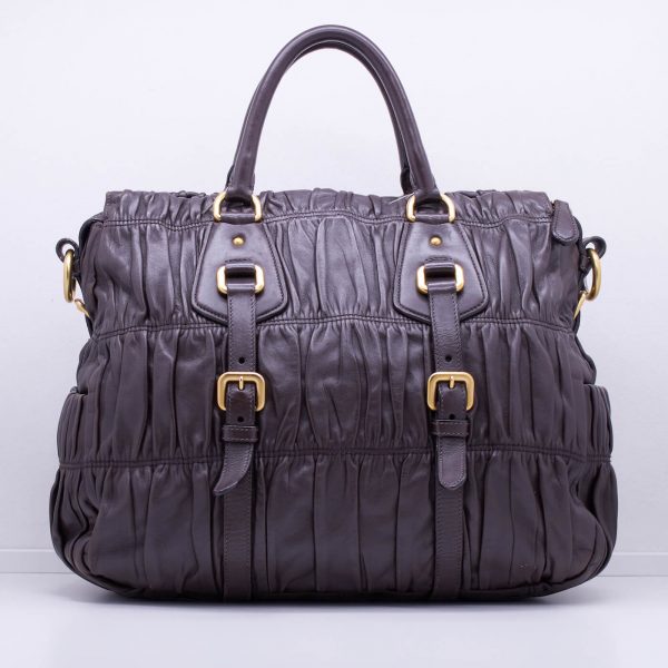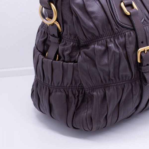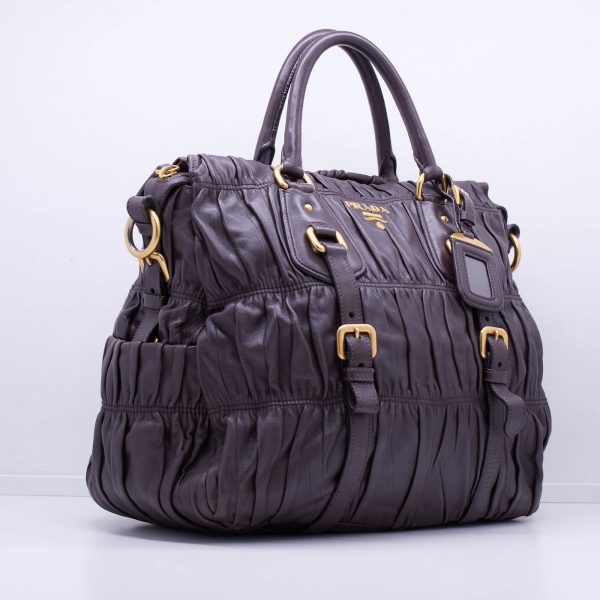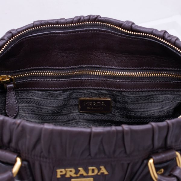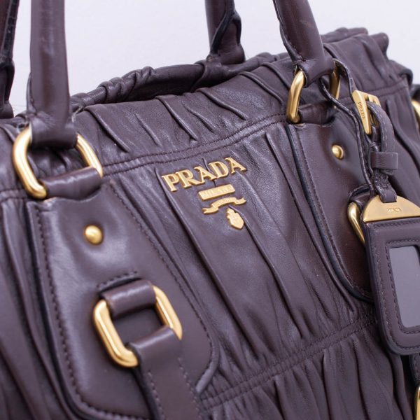 Eine verspielte Tasche von Prada – gerafftes, braunes, weiches Nappaleder kombiniert mit goldener Hardware. Eine sehr schöne Handtasche, in die auch einiges hineinpasst – ein wahrer Alltagsheld.