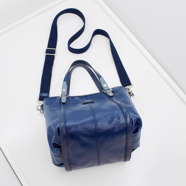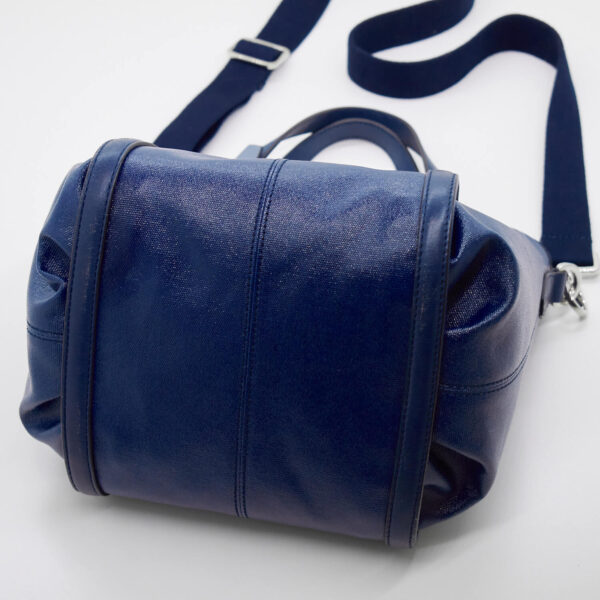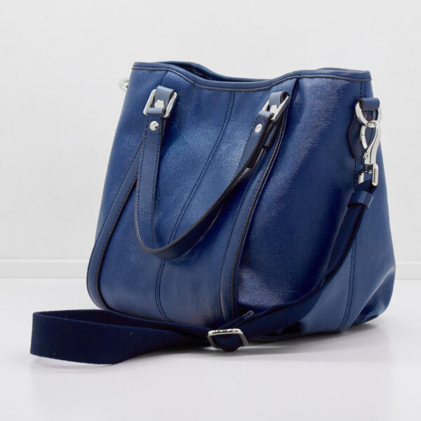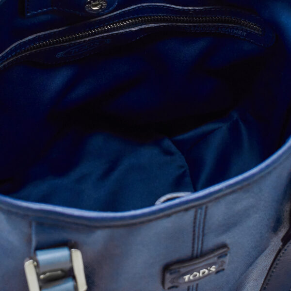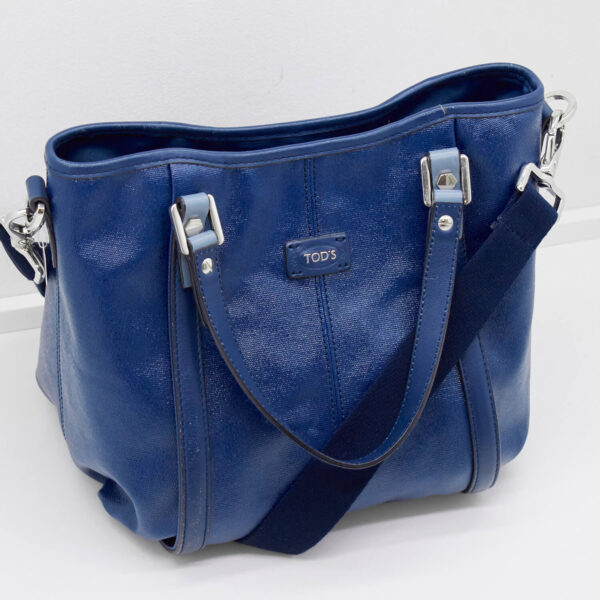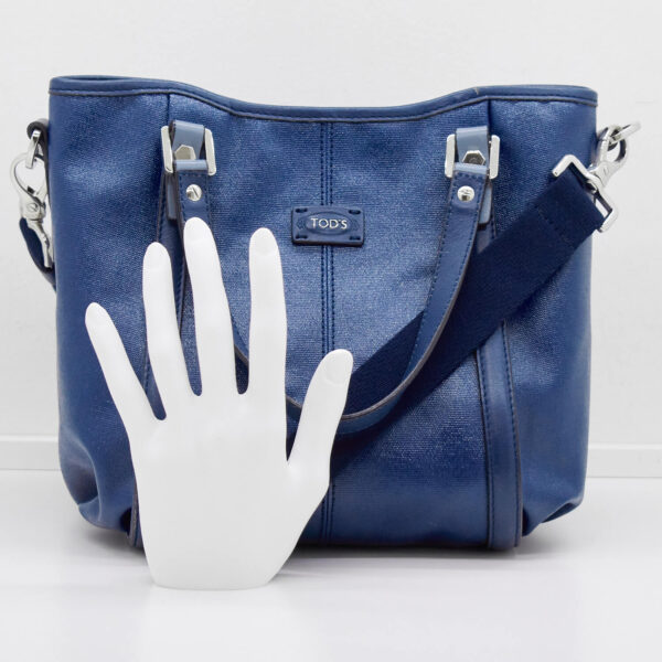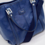 Diese Tod’s Tasche ist ein echter Eyecatcher: Im Licht beginnt der hochwertige, blaue Stoff zu glitzern und macht diese Tasche zu einer Einzigartigkeit. Diese Tasche kann feminin in der Hand oder sportlich am Körper getragen werden, da sie über einen abnehmbaren, verstellbaren Schultergurt verfügt. Das Innere der Tasche ist mit einem blauen Satinstoff ausgekleidet und verfügt über zwei Einsteckfächer und einem Fach, welches sich über einen Reißverschluss schließen lässt. Die Tasche lässt sich über einen Druckknopf verschließen.