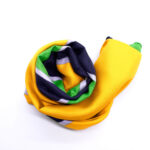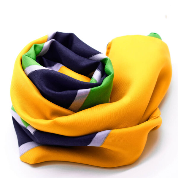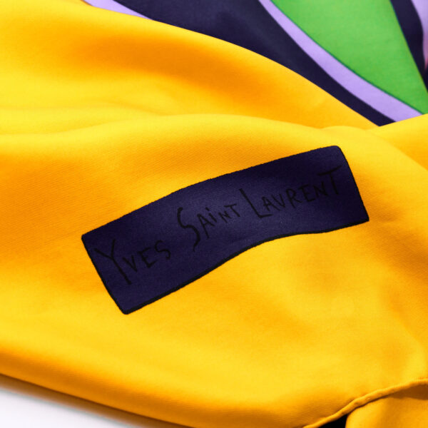 Einzigartiges „Color Blocking“ Motiv. Dieses Vintage Seidentuch besticht mit gelben, grünen, blauen und hellblauen Akzenten.